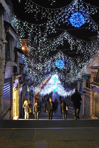 well it is magnificent when you take the scaffolding away. The price we pay for traveling out of season is that winter is when they face-lift all significant buildings to be really spiffy for all the ‘real’ tourists in summer. Fortunately we have seen it in all its glory on a previous visit. I went in, although I just looked at the bits I could see for free, well worth it because of the unique gold mosaic that covers the vast interior. Last time we paid and saw it all, even the bonze horses at the top which don’t appear to be there now so perhaps they’re getting a facelift too. This square is so majestic even with the big screen up ready for some festivities to come I think.